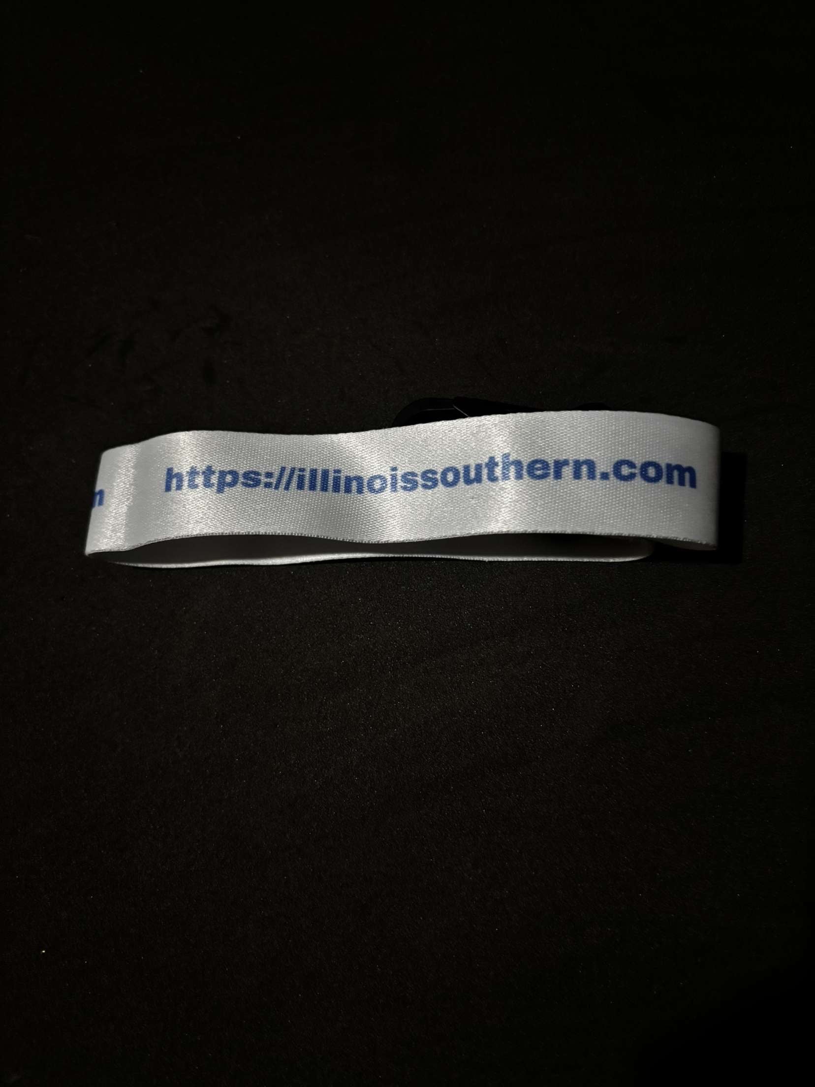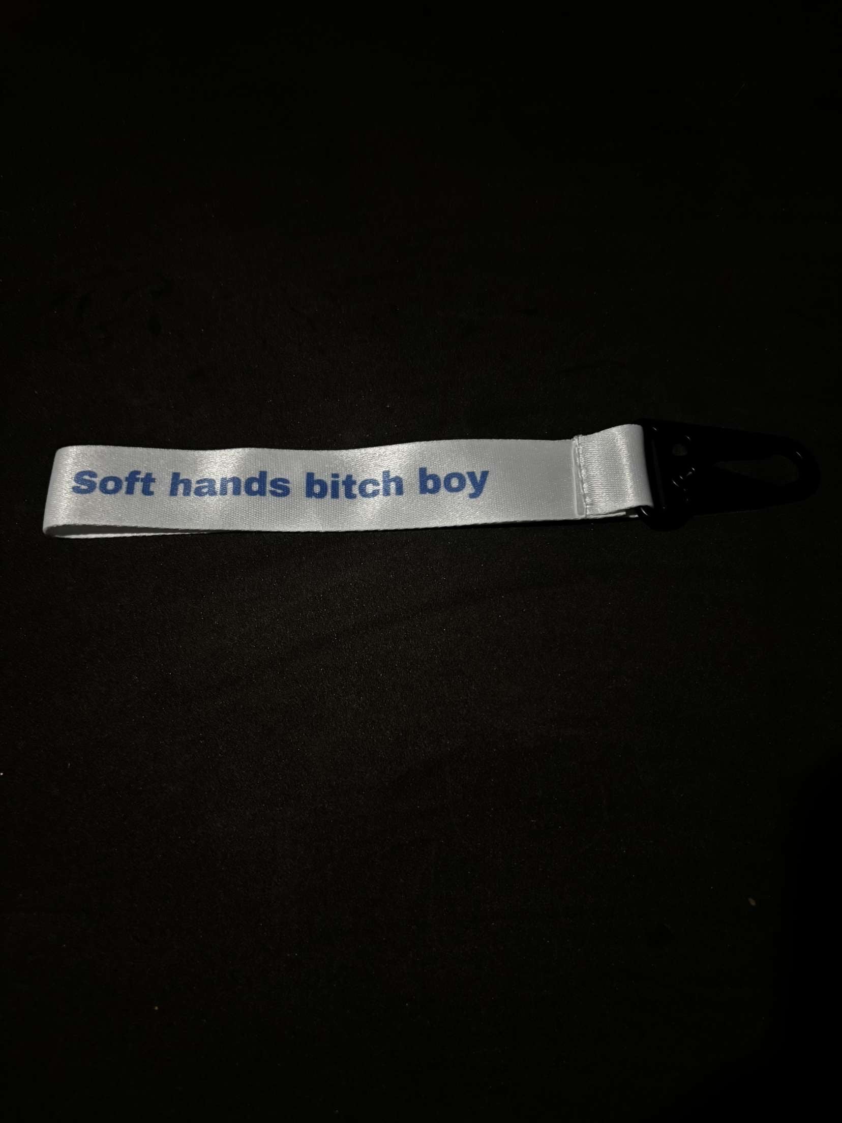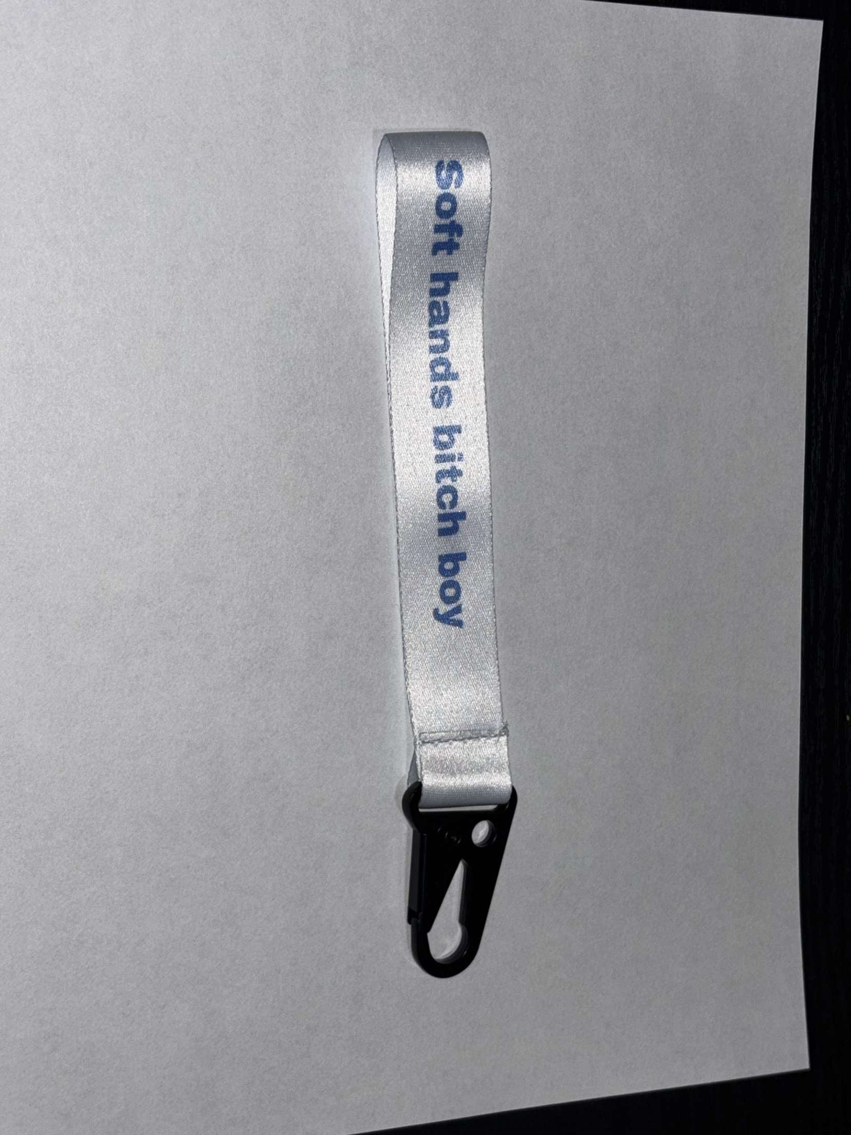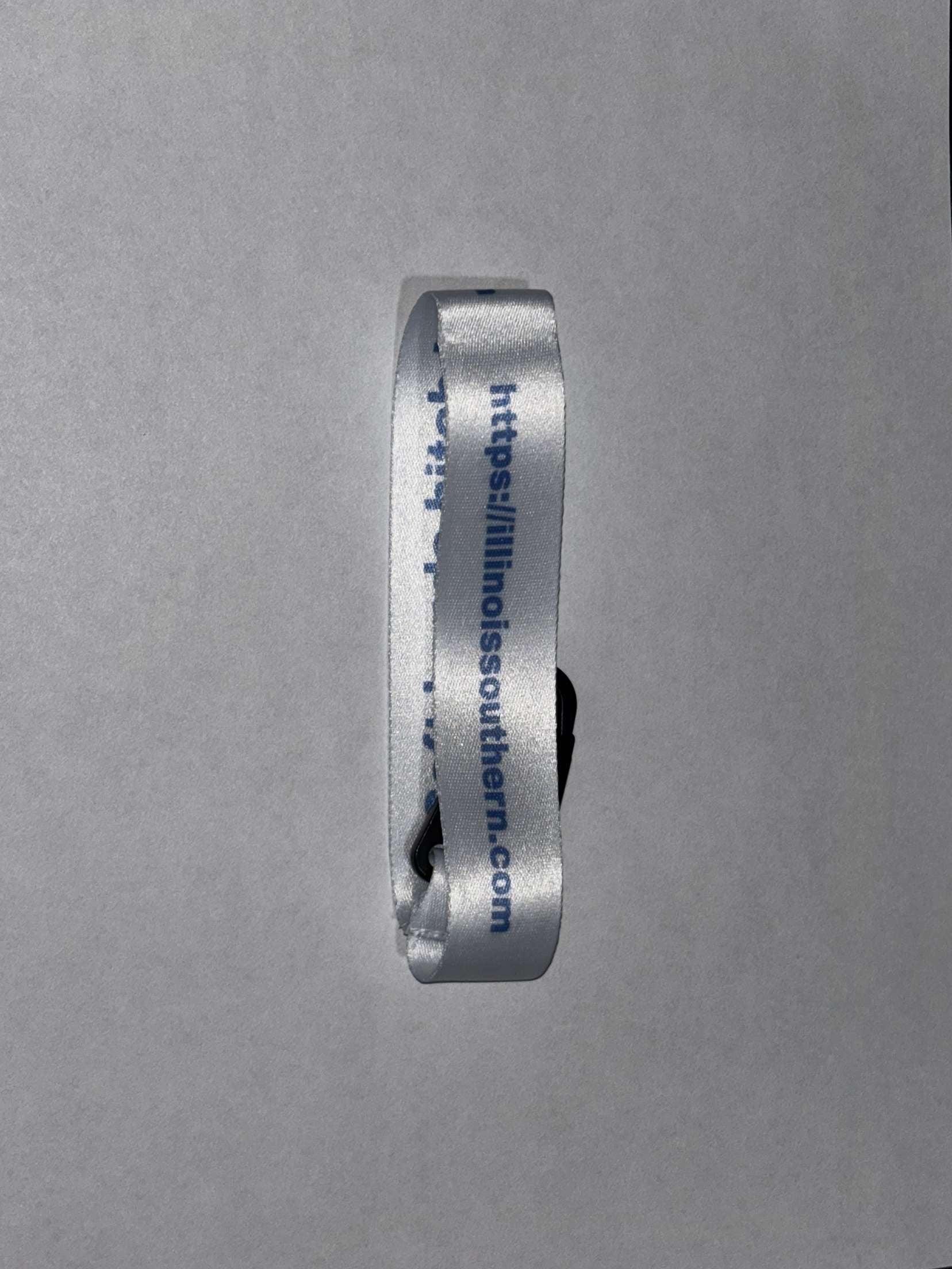 small white lanyard with blue lettering and black metal clip to attach to keys.